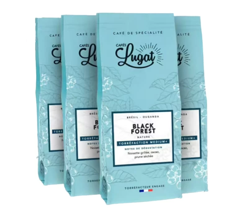 Ce café en grain Black Forest est un blend 100 % Arabica du Brésil et d’Ouganda spécialement assemblé et torréfié en France par les torréfacteurs des Cafés Lugat. Café aux notes de noisettes grillées, cacao, prunes séchées. Conditionnement 4×250 Gr.
