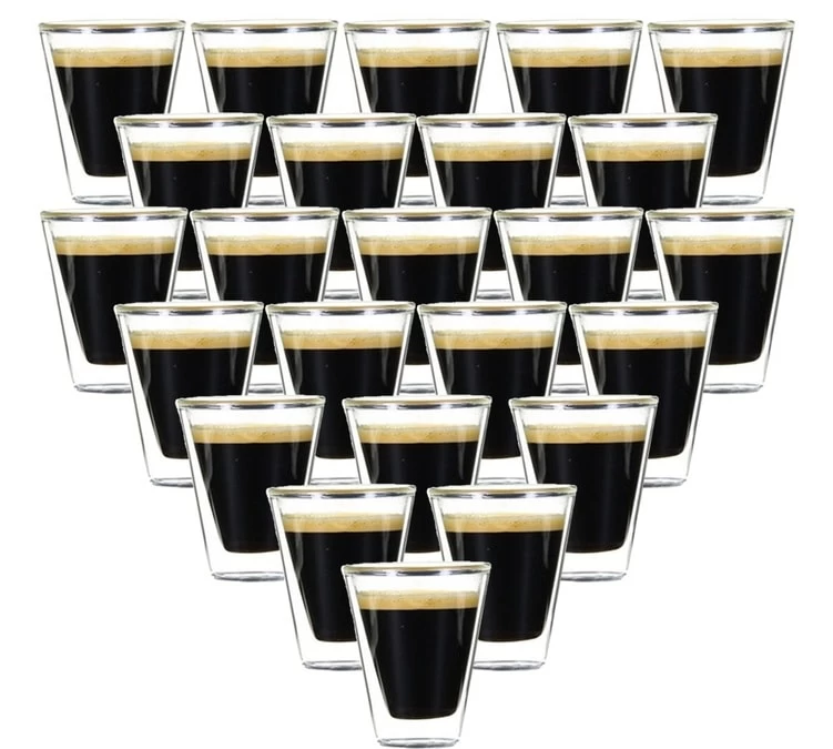 Lot de 24 verres double paroi « Caffeino » Bormioli Rocco d’une contenance de 8.5 cl. Idéal pour le café, la double paroi vous évitera les brûlures lors de la prise en main de la boisson chaude. Livraison gratuite.