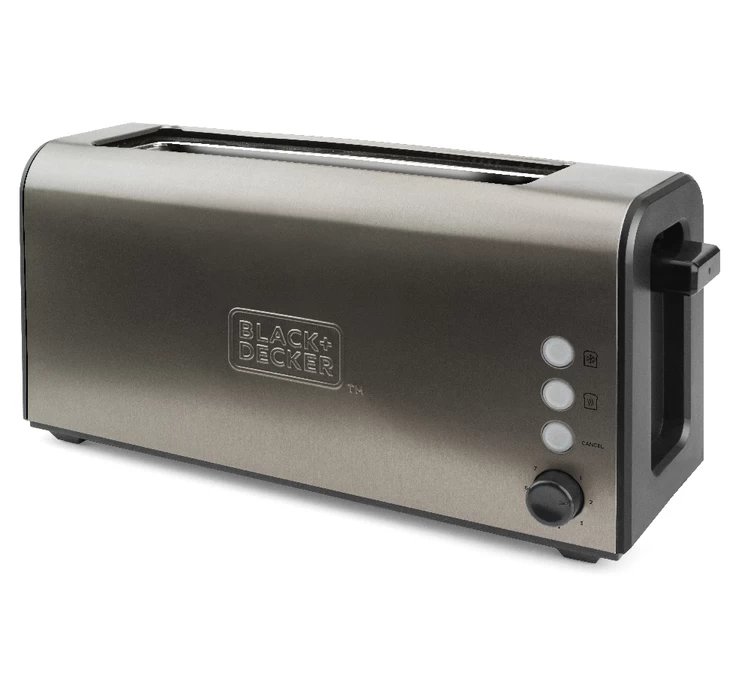 Le grille-pain BLACK+DECKER 1000W est parfait pour griller tous types de pain, quelles que soient sa forme et sa taille, grâce à sa grande fente. Il dispose d’une fonction d’arrêt permettant d’interrompre le grillage et ainsi, vous évitez de patienter devant. Son système de centrage permet au pain d’être grillé avec harmonie.