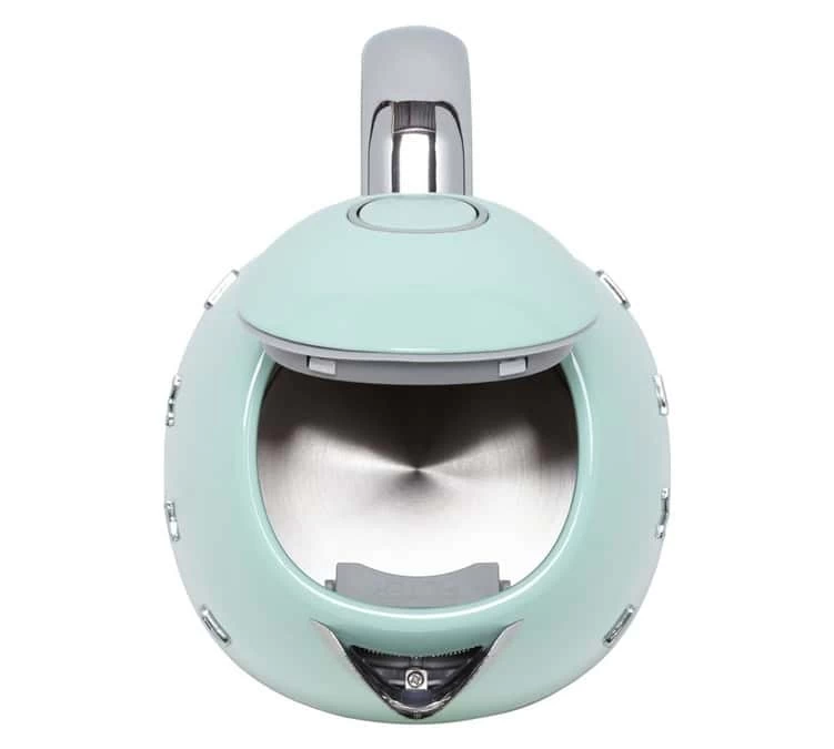 Cette bouilloire au style rétro est dotée d’un corps en acier inoxydable qui lui confère durabilité et résistance. Son design arrondi et sa couleur vert d’eau nous rappelle les beaux jours d’été. Vous apprécierez ses détails chromés sur la poignée et la base.