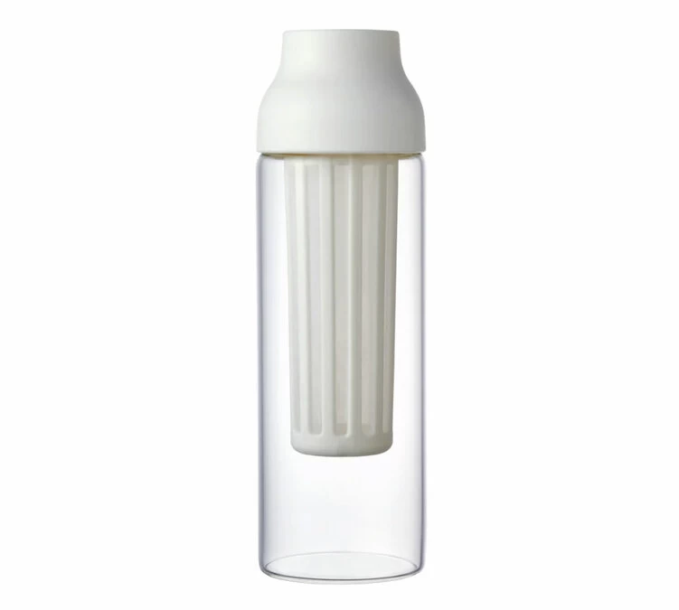 Carafe Kinto Capsule blanche en verre avec infuseur, pour l’extraction à froid de votre café ou de votre thé préféré. Contenance : un litre. Simple à utiliser.