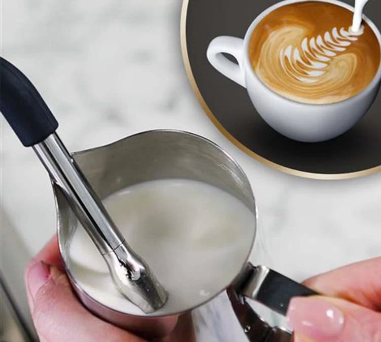 La molette en façade permet de distribuer de l’eau ou d’activer la vapeur pour réaliser de parfaites mousses de lait avec la buse vapeur en inox. Un pichet est fourni avec la machine pour pouvoir commencer à faire un bon cappuccino, latte ou autres boissons lactées.