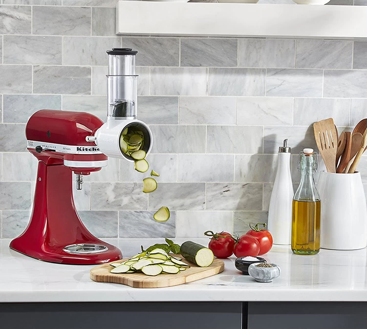 Facilitez votre quotidien en utilisant ce tranchoir/râpe compatible avec le robot pâtissier Artisan de KitchenAid. Ils se fixent sur le moyeu de fixation polyvalent du robot KitchenAid.